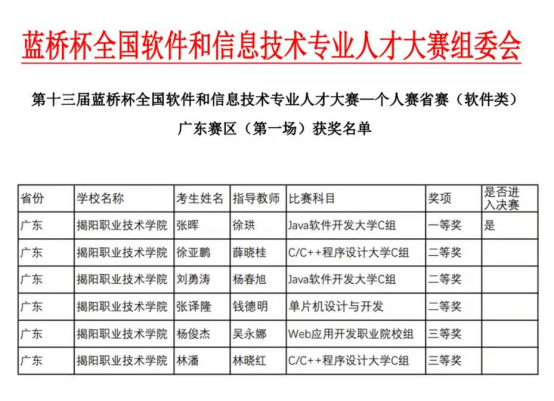 4月28日,工业和信息化部人才交流中心主办的第十三届“蓝桥杯”全国软件和信息技术专业人才大赛广东省赛区组委会传来喜讯,我校信息工程系6名学生在众多选手中脱颖而出,再创佳绩。其中,由徐珙老师指导的学生张晖勇夺软件类Java软件开发赛项一等奖,并成功晋级将于6月18日举行的全国总决赛。5名同学分别在其他赛项中取得3名二等奖、2名三等奖的佳绩。