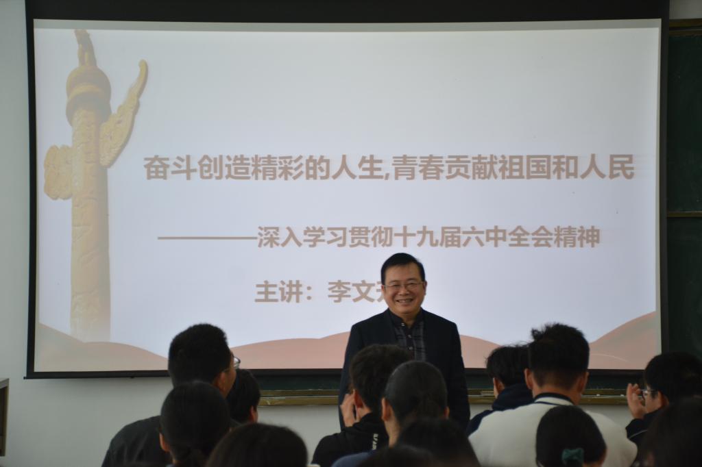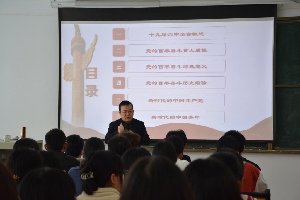 李文升以党的十九届六中全会通过的“两个决议”切入,紧紧围绕党的十九届六中全会胜利召开、党的百年奋斗重大成就、党的百年奋斗历史意义、党的百年奋斗历史经验、新时代的中国共产党及新时代的中国青年七个方面展开授课。重点对百年历程“四个伟大飞跃”、马克思主义中国化的“三次飞跃”、重要成果、“两个确立”的意义、新时代取得的13方面成就、“十个坚持”、中国共产党百年奋斗的五方面历史意义等多方面对全会精神为学生做了深入解读。李文升指出,党的十九届六中全会的召开处于第一个百年奋斗目标已经实现、正在开启全面建设社会主义现代化强国新征程的重要时间节点上,是增强“四个意识”、坚定“四个自信”,做到“两个维护”,确保全党步调一致向前进的历史需要,同时也是党自我革命,团结带领全国各族人民为实现中华民族伟大复兴的中国梦继续奋斗的需要,同学们只有充分了解和认识其重要性,才能在学习过程中更好地把握重点,更好地在日常学习生活中融入对十九届六中全会精神的理解。课中,李文升还结合了丰富而生动的例子进行授课,生动的语言,深长的意蕴,精辟的分析,使学生们更加充分理解党的十九届六中全会的重大意义以及新时代青年的担当。