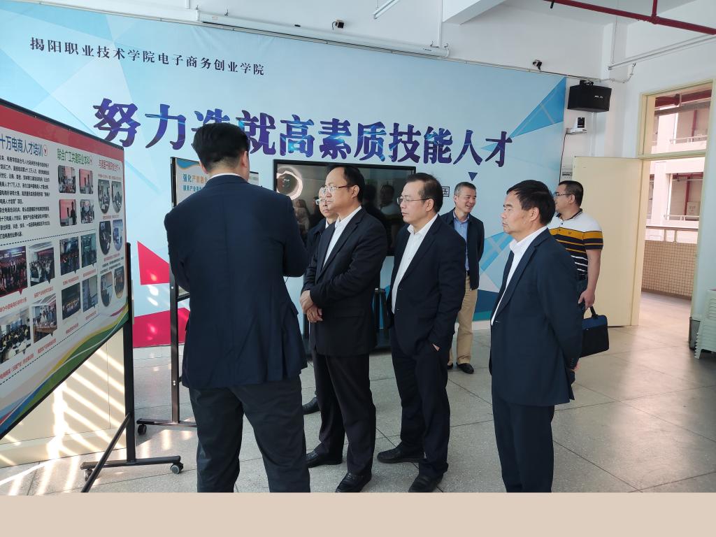 崔建军在调研中强调,职业教育是国民教育体系和人力资源开发的重要组成部分,要深入贯彻落实全国职业教育大会精神,扎实实施我省职业教育“扩容、提质、强服务”三年行动计划,坚持立德树人、德技并修、面向实践、面向市场,深入推进育人方式、办学模式改革,协同推进产教深度融合,主动吸纳行业龙头企业深度参与职业教育专业规划、课程设置、教材开发、教学设计、教学实施,拓展校企合作形式内容,切实增强职业教育适应性,推动形成产教良性互动、校企优势互补的发展格局,培养更多高素质技术技能人才。要聚焦产业发展,充分发挥揭阳市电商职教联盟作用,扎实开展电商技能人才培养培训,助力揭阳企业数字化转型。要联合培训机构和广东农村电商网络学院,开展农村电商人才培训辅导,促进农村电商与现代农业发展相融合,为农产品插上电商的翅膀,助推全市打造更多“淘宝镇”,服务揭阳乡村振兴。