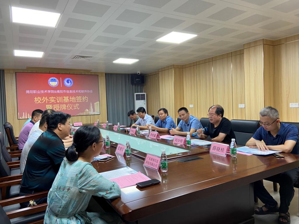 8月4日上午,学校罗恢远院长带领实训与信息中心、信息工程系、经济管理系等部门负责人到揭阳市信息技术和软件协会开展校企合作调研座谈并举行实训基地签约与挂牌仪式。学校副院长李桂鑫、揭阳市信息技术和软件协会会长邝兴望、副会长邝少雄、许锦山、黄佳斌、监事长章树华以及协会理事单位、会员单位共15家企业参加活动。