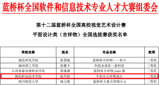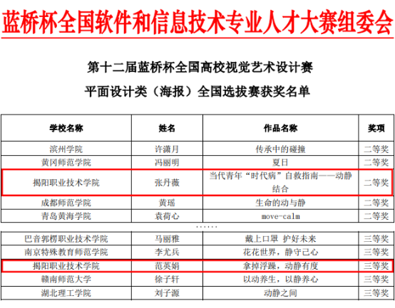 近日,第十二届“蓝桥杯”全国软件和信息技术专业人才大赛 ——视觉艺术设计赛传来喜讯,我校信息工程系学生在本届赛事中勇夺佳绩。在信息工程系陈锐彬、李宗辉、林洁新等老师的精心指导下,张丹薇、陈丹婷、范英娟等同学分别获得该赛项二等奖和三等奖。