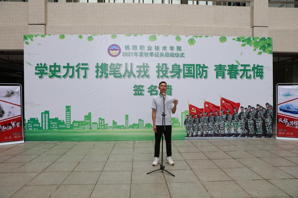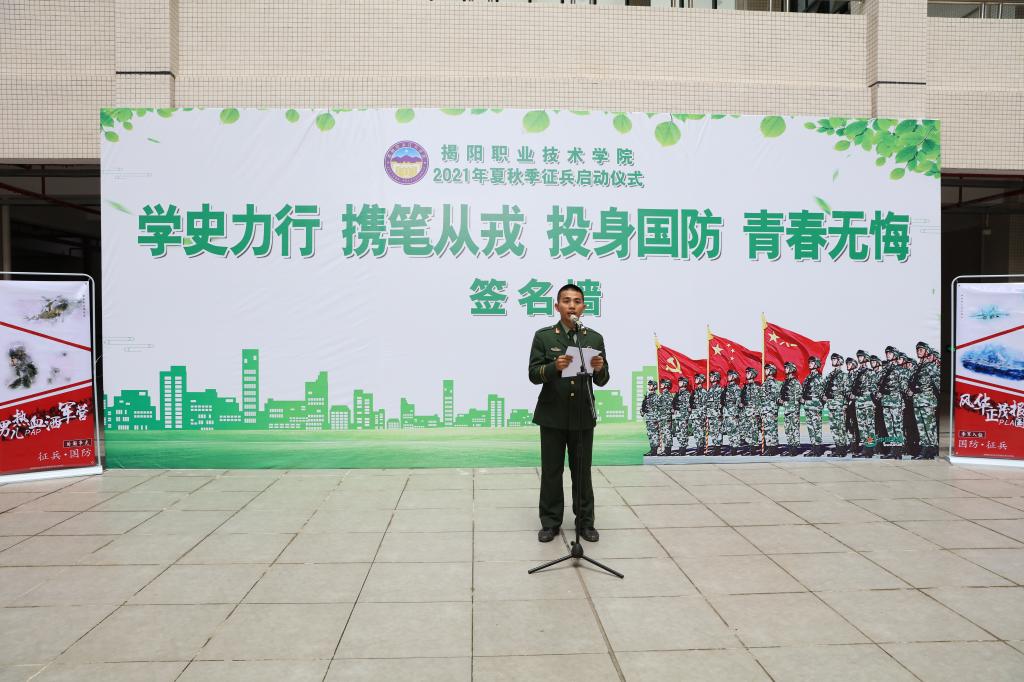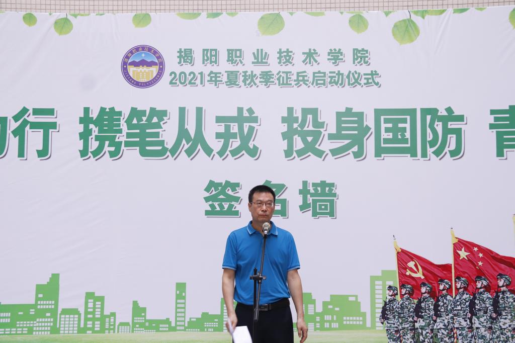 根据学校征兵工作方案的安排,6月17日下午,我校在教研楼1楼举行2021年夏秋季大学生应征入伍工作启动仪式。揭阳市军分区动员处处长李磊、榕城区人武部部长徐进森,学校党委副书记、征兵领导小组副组长姚玉平,宣传统战部副部长欧俊勇、信息工程系党总支书记刘彩琼、生物工程系党总支书记罗集丰、化学工程系党总支副书记陈敏杰、学生工作处综合科科长陈炳亮和各系(院)负责征兵工作的辅导员老师,以及有意向入伍学生及学生代表共100多人参加启动仪式,学生工作处处长、征兵工作站站长王烁生主持启动仪式。