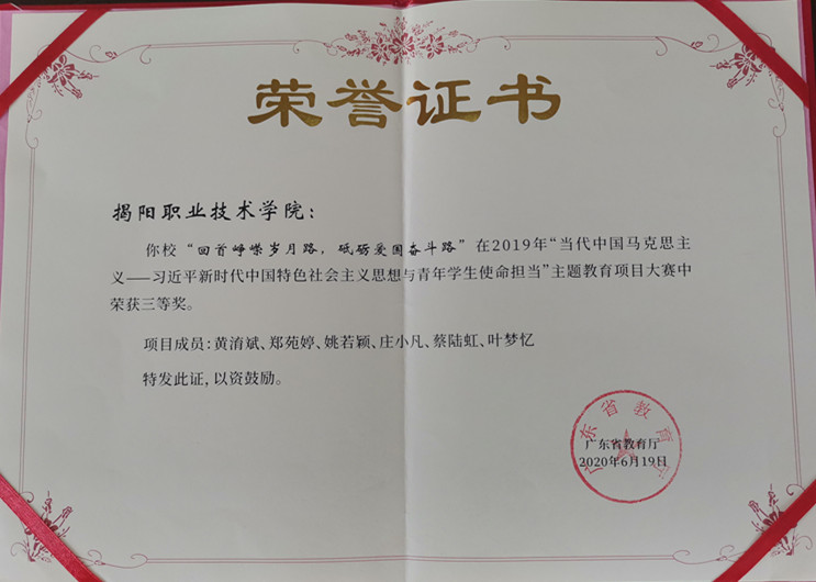 我校“回首峥嵘岁月路,砥砺爱国奋斗路”项目在广东省教育厅举办的2019年“当代中国马克思主义——习近平新时代中国特色社会主义思想与青年学生使命担当”主题教育项目大赛中荣获三等奖。