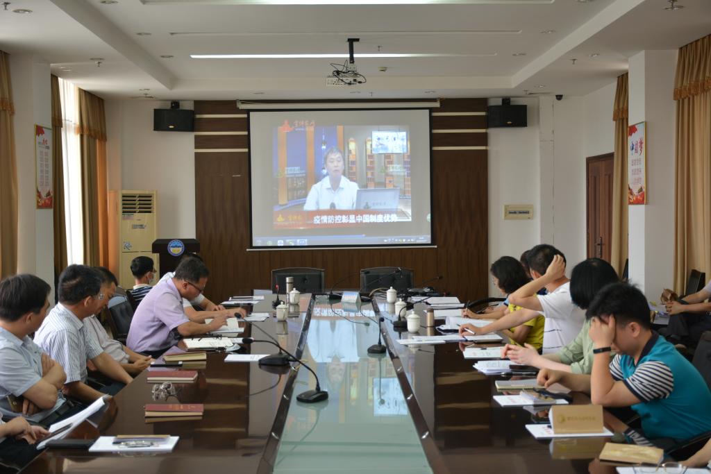 5月27日上午,我校在行政楼507会议室召开党委理论中心组(扩大)学习会议,组织学习宣讲家网左鹏教授关于《疫情防控彰显中国制度优势》的视频,并结合当前疫情防控形势,部署我校贯彻落实工作。会议由院长龚善初主持,党委成员、纪委委员、各党(总)支部负责人、各部门、各系(部、院)部门负责人参加会议。