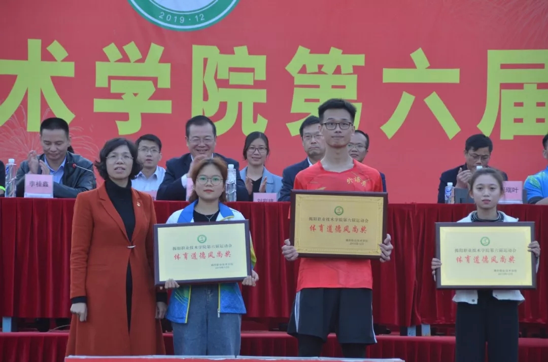 闭幕式上,国家一级裁判、本次校运动会总裁判长程新年宣读第六届运动会比赛成绩;刘瑞叶副院长宣读第六届运动会代表团体育道德风尚奖。同时,进行多项荣誉颁奖仪式。姚玉平副书记向广东海兴控股集团和广东望天湖现代农业科技有限公司颁发“体育运动热心支持单位”荣誉;刘瑞叶副院长给信息工程系、外语系、师范教育系颁发“体育道德风尚奖”。李文升书记、姚玉平副书记、刘瑞叶副院长分别为获团体总分前三名代表队颁奖。此次校运会团体总分第一名:甲组生物工程系,乙组体育教育192班;团体总分第二名:甲组师范教育系,乙组五年制体育教育162班;团体总分第三名:甲组机电工程系,乙组体育教育191班。
