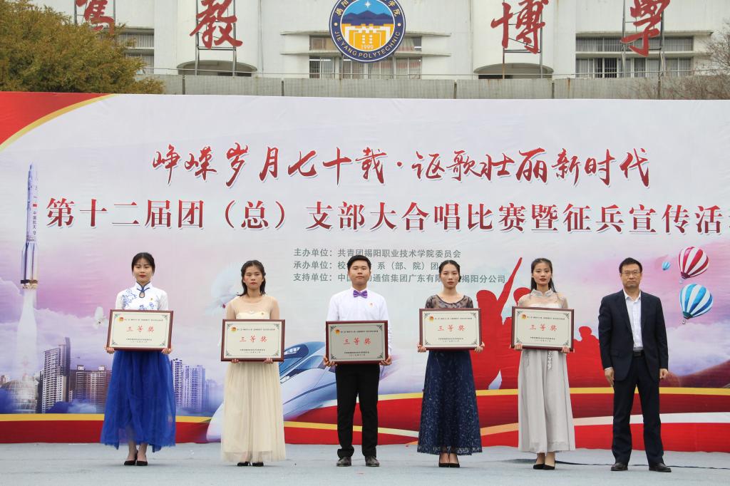 为庆祝中华人民共和国成立70周年,加强学生对党史国史校史教育,激发学生爱党爱国爱校热情,强化大学生国防观念,激发参军报国热情,营造爱国强军的大学文化氛围,11月28日,我校在朝阳广场隆重举办了第十二届团(总)支部大合唱决赛暨征兵宣传活动。校党委副书记、院长龚善初,校党委副书记、纪委书记姚玉平,学生工作处处长(校团委)负责人,各系党总支负责人,以及各系(部、院)团总支书记、辅导员、教职员工和学生共5000多人一同观看本次比赛。