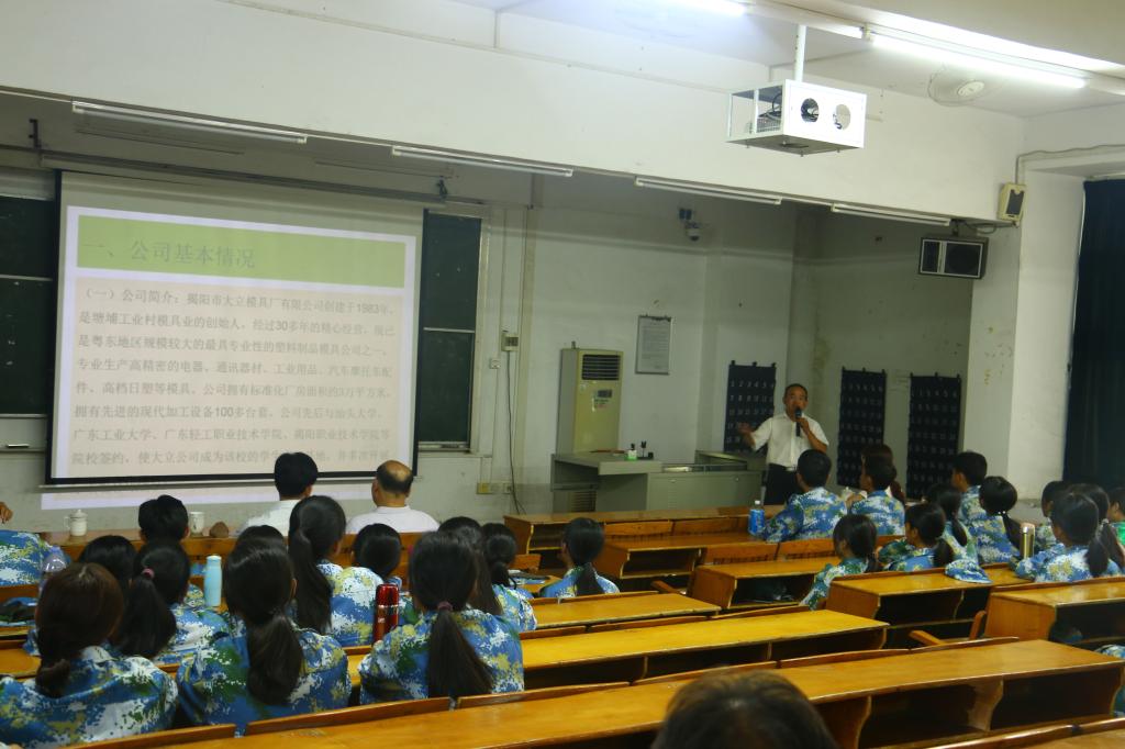 9月19日下午,“大立现代学徒制班”校企生交流会在教学楼CT22召开。出席交流会的有揭阳市大立模具厂有限公司董事长黄建深、厂长陈树钦、人力资源经理余育史、机电工程系主任孙培明、党总支书记方春城,以及模具专业多位教师。本次交流会主要面向模具设计与制造专业的2019级新生,宣讲“大立现代学徒制班”的办学情况。