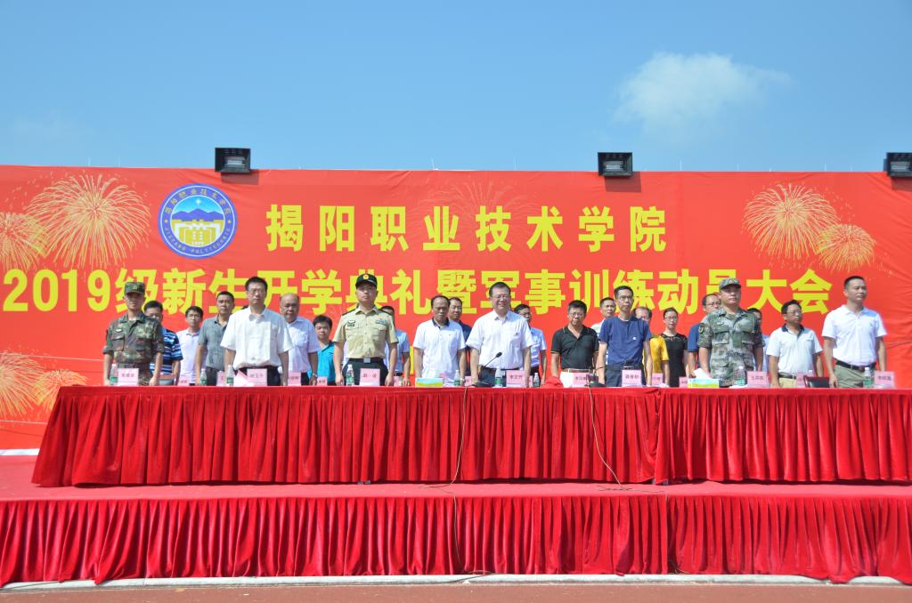 9月16日上午,我校在田径运动场举行2019级新生开学典礼暨军训动员大会。驻揭某部队和揭阳市军分区首长,校党委书记李文升,院长龚善初,党委副书记、纪委书记姚玉平,副院长李桂鑫,以及学校教务处、学生工作处负责人,各系(部、院)负责人和党总支部负责人,在校新生1900多人参加此次大会。大会由龚善初院长主持。