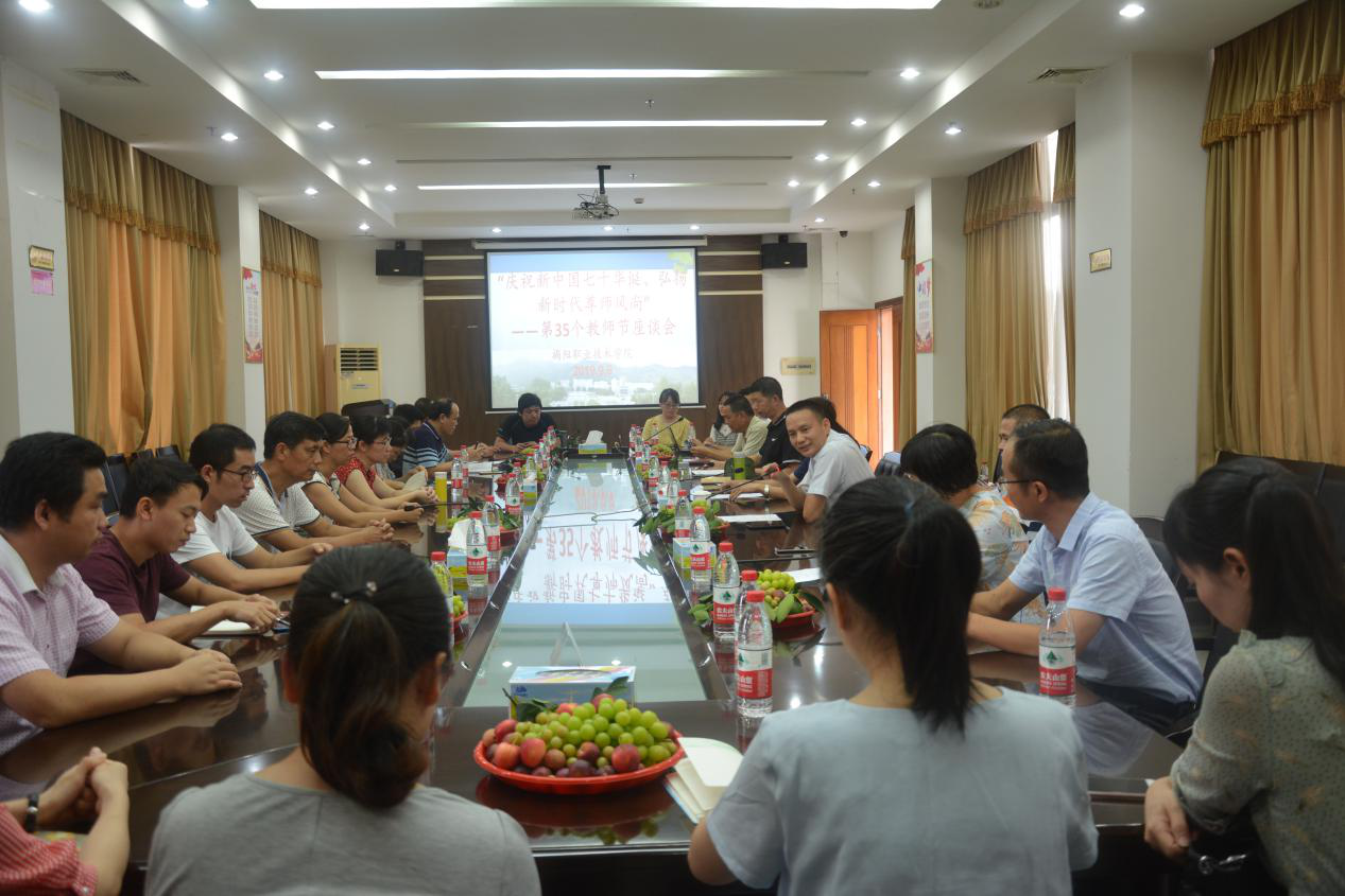 桂魄初生秋露微,九月桃李满芬芳,在第35个教师节来临之际,9月9日下午,学校党政领导和教职工代表欢聚一堂,在行政楼507会议室召开“庆祝新中国70华诞,弘扬新时代尊师风尚”教师节座谈会。院长龚善初参加会议并讲话。座谈会由副院长李桂鑫主持。