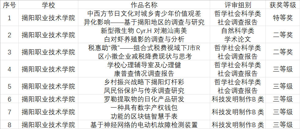 大赛自今年3月份启动以来,共有156所高校、2029件作品参赛,“省一校一院”三级覆盖参赛人数超17万人,参赛作品和人数再创历史新高。最终全省135所高校的808件作品入围终审决赛。在今年的竞赛中,我校共推荐9个作品进行参赛,其中3个作品入围终审决赛,最终获得特等奖1项、二等奖2项、三等奖5项的好成绩。学校总体成绩位列粤东西北同类院校前茅。