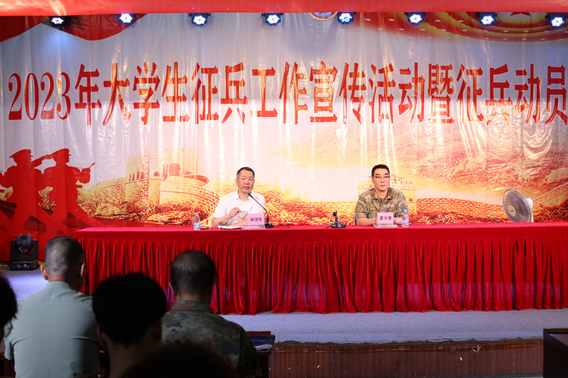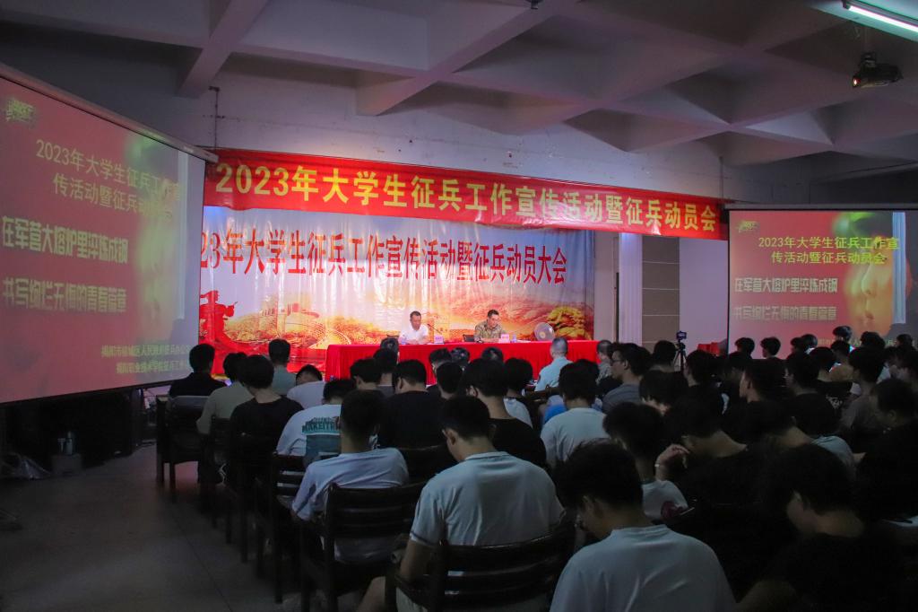6月8日下午3点,我校在第一食堂三楼会议室举行2023年大学生征兵工作宣传活动暨征兵动员大会。榕城区委常委、区征兵工作领导小组副组长、区人武部上校政委夏令莹,区人武部军事科科长阎英以及榕城区人武部征兵办全体工作人员,学院征兵办公室全体人员,各系(部、院)征兵工作的辅导员老师,以及230多名学生代表参加本次活动。活动由学生工作处负责人钟洁生主持。