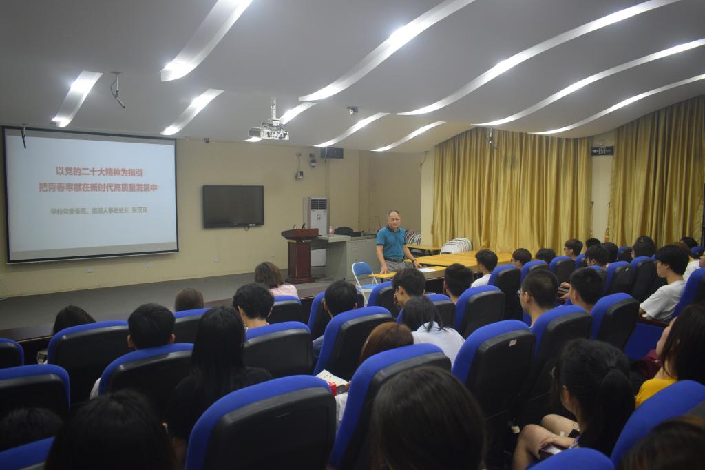 6月15日,学校党委委员、组织人事处处长张汉良深入生物工程系药学专业221班,为学生讲授了一堂题为《以党的二十大精神为指引,把青春奉献在新时代高质量发展中》的思政课,本次活动由生物工程系党总支书记罗集丰主持。