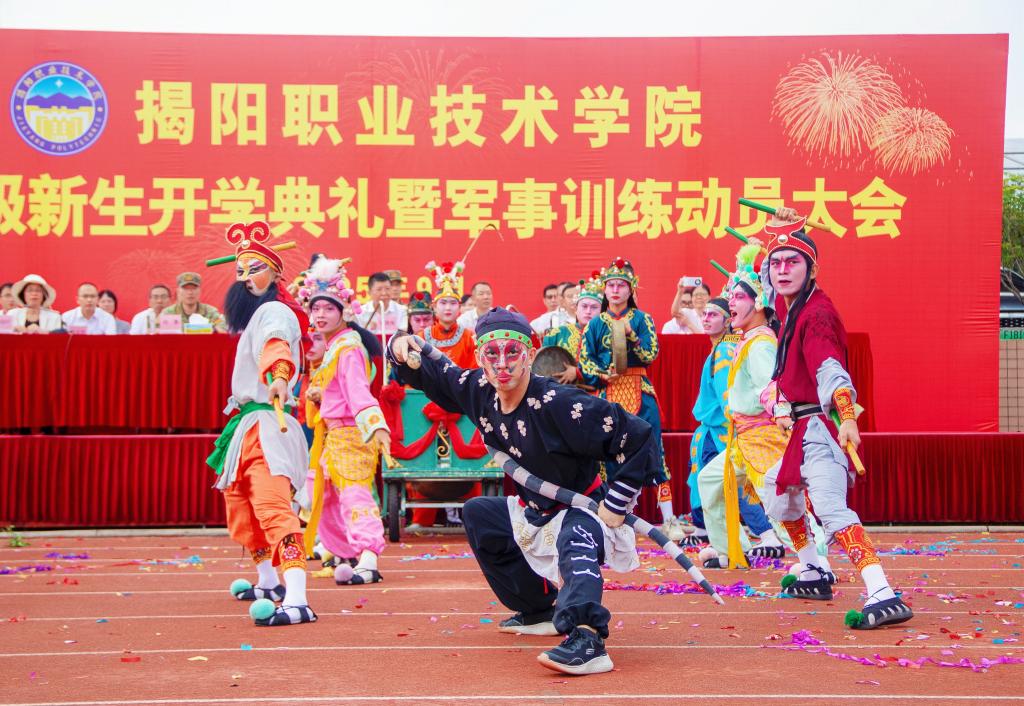 活动以“青春序曲”环节预热现场,营造气氛。校艺术团师生率先登台献唱《日不落》《第一天》《春风十万里》等曲目,青春的旋律展现学子们的蓬勃气息。紧接着,2025届电子商务专业校友、揭阳青狮第四代传承人—孙楠及狮队带来狮舞《狮王启慧 青程似锦》,富美青年英歌队带来普宁英歌《中华战舞 青春飞扬》,国家级非遗项目展演,为全体新生上了一节深刻而澎湃的中华优秀传统文化第一课。
