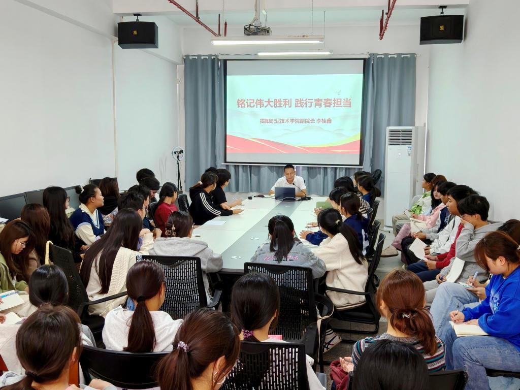 10月23日下午,学校党委委员、副院长李桂鑫到外语系,为2025级小学英语教育(专本协同)、商务英语专业学生讲授了一堂题为“铭记伟大胜利践行青春担当”的思政课。