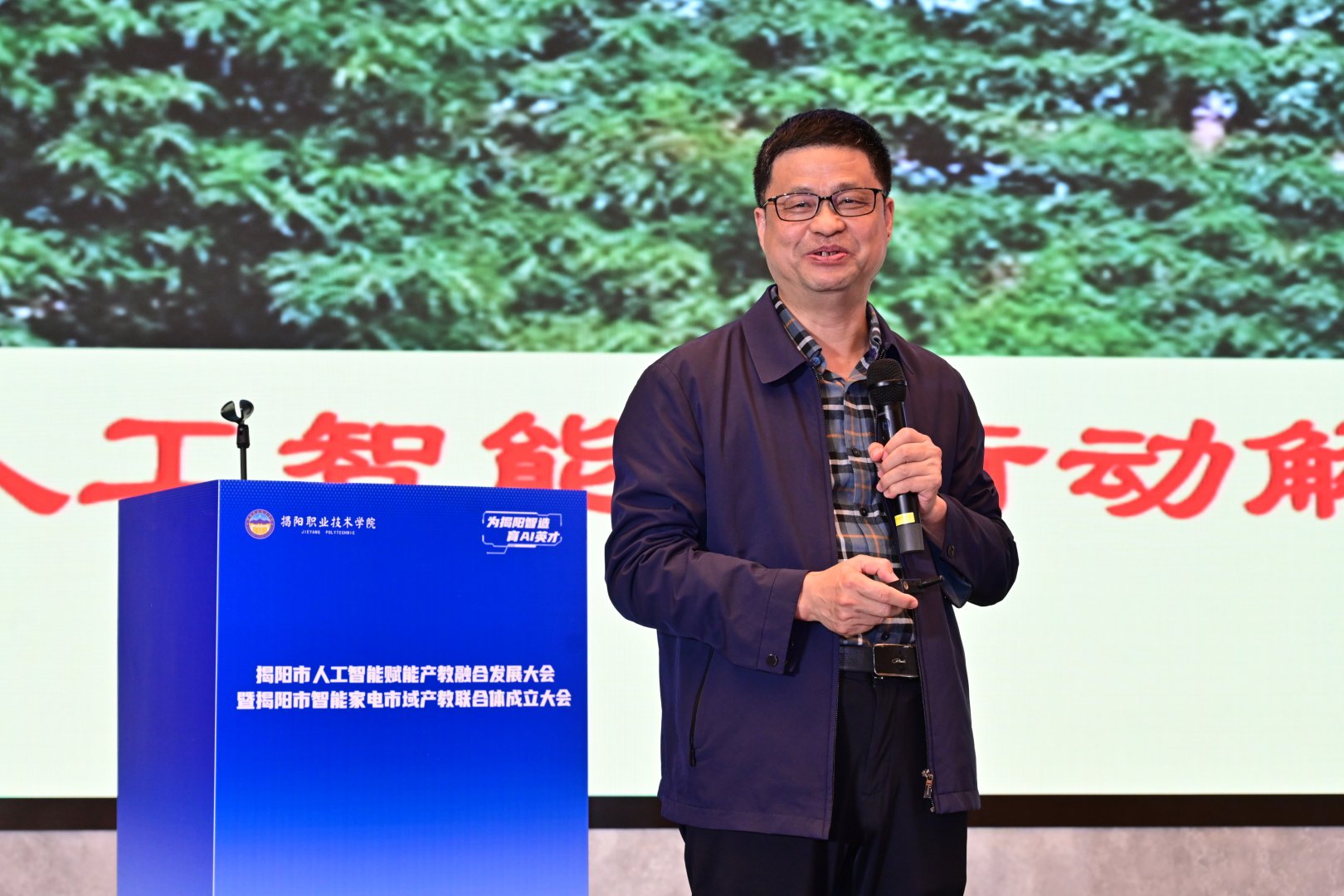 特邀专家报告环节精彩纷呈。华南理工大学刘桂雄教授围绕“人工智能+行动与揭阳产业发展机遇”,广东工业大学邓耀华教授聚焦“人工智能大模型赋能高端电子精密检测及应用”,分别作专题报告,为揭阳产业转型升级与校企深度合作提供了新思路、新方向。中国电信、华为等企业代表也分享了各自在人工智能领域的技术成果与实践经验,为深化产教融合、推动教育数字化转型提供了有益借鉴。