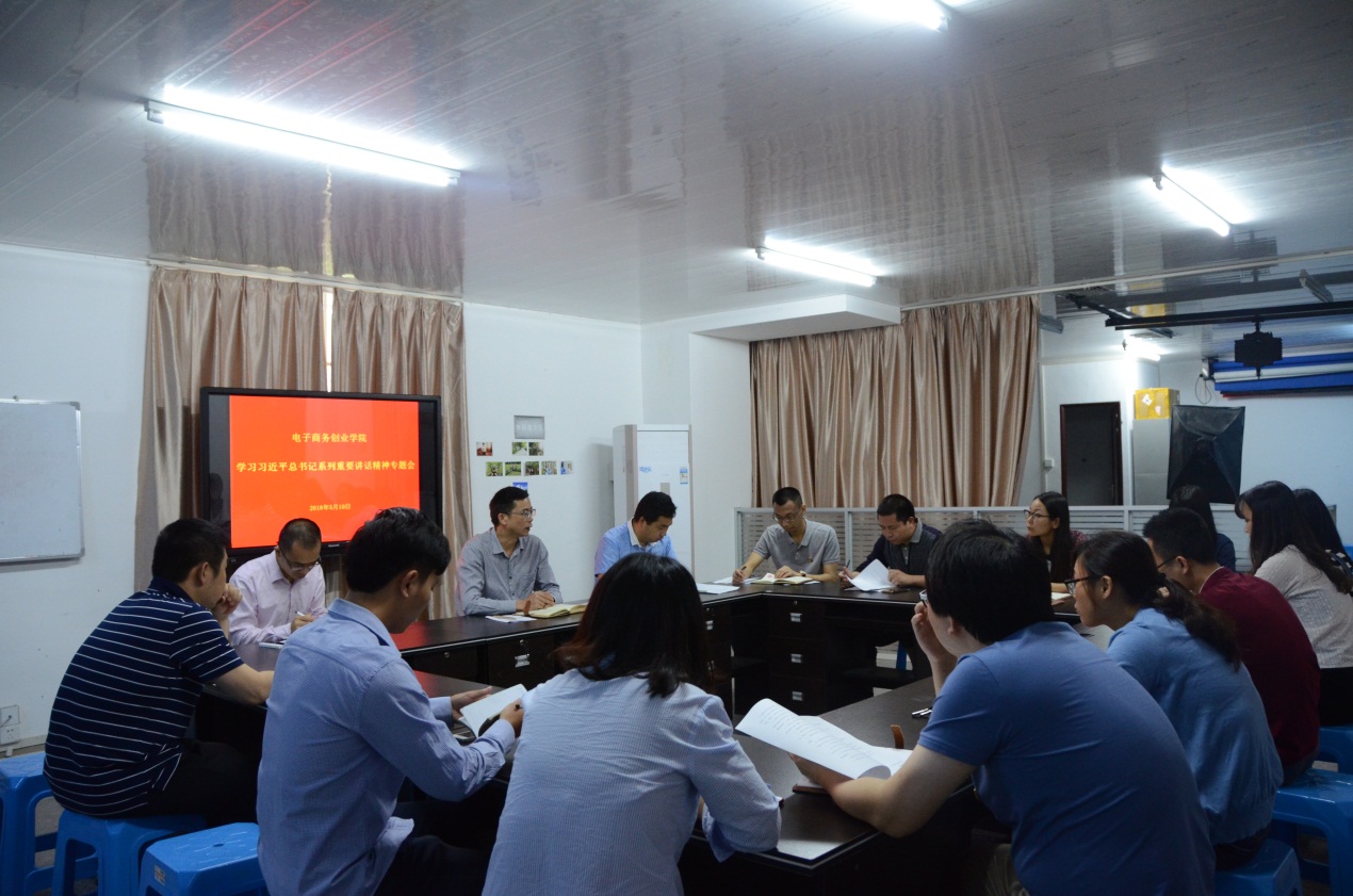 5月10日下午,电子商务创业学院在美工工作室召开学习习近平总书记系列重要讲话精神专题会,会议由电子商务创业学院党总支书记兼副院长张秋潮同志主持,电商学院全体教职工参加会议。