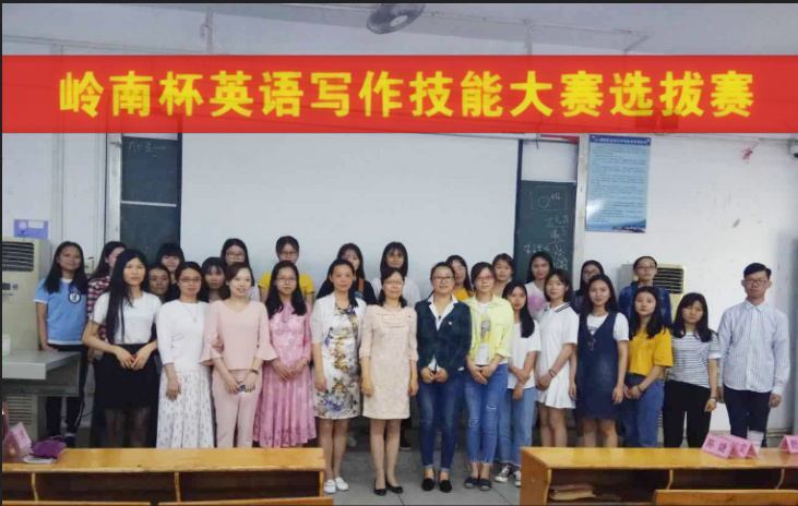2018年4月25日,由外语系、学生社团联合会和英语俱乐部联合举办的第六届岭南杯写作技能大赛选拔赛颁奖活动在教学楼CT31举行。出席此次颁奖活动的老师有外语系负责人邱瑞君副主任、外语系郑骋书记、外语系郑洁雯副主任、商务英语教研室主任林丹蔚老师、大学英语教研室主任陈婕老师、舒锐老师、陈朝虹老师等。