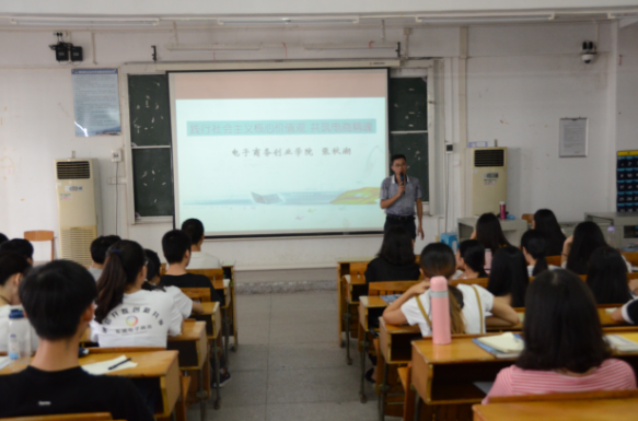 2017年9月28日上午,电子商务创业学院党总支书记张秋潮在教学楼AT32为电商学院16级全体学生讲授新学期“思政第一课”。张秋潮书记讲授的主题是《践行社会主义核心价值观,共筑电商精魂》,旨在对电商学院学生价值观引领上起到指引作用。
