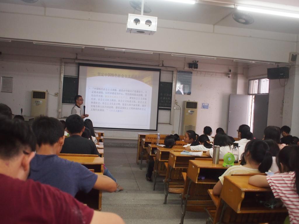 课堂上,赖书记结合当下大学生普通关注的时事热点,教育引导我系学生正确认识世界和中国发展大势,从我们党探索中国特色社会主义历史发展和伟大实践中,认识和把握人类社会发展的历史必然性,不断树立为共产主义远大理想和中国特色社会主义共同理想而奋斗的信念和信心,引导同学们树立正确的世界观、价值观、人生观,认真贯彻学习“四个自信”,正确认识时代责任和历史使命,用中国梦激扬青春梦。