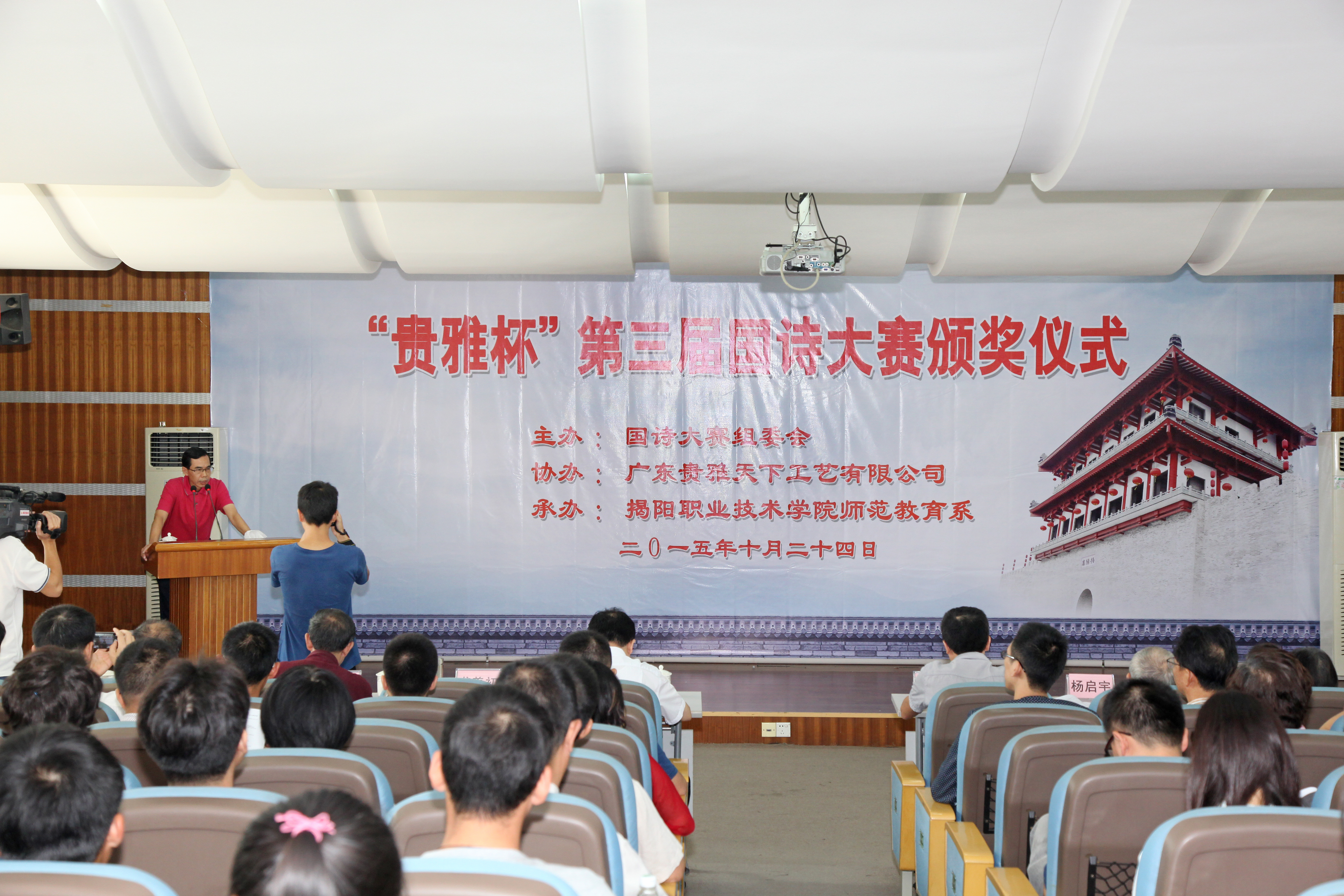 学院师范教育系负责人李汉潮主持了会议。院长龚善初在会上致辞,对出席大会的各位学者、诗人表示热烈的欢迎,他表示,当前国学热方兴未艾,作为国学精粹的传统诗词在蓬勃发展,揭阳是有二千年文字记载的文化古邑,国诗大赛颁奖大会在揭阳举办将对推动揭阳市传统文化发展和诗教进校园活动起到积极的促进作用。广东贵雅天下工艺有限公司一贯重视传统文化,代表郑重人在讲话中对国诗的发展提出殷切期望,希望能通过国诗大赛发掘出更多的有潜力的诗人。诗教网国诗论坛总裁,国诗大赛创办人和主持人林英男先生认为本次大赛无论从参赛人数还是作品质量上都有了新的提高,随着贵雅天下工艺有限公司对国诗大赛的冠名,国诗大赛这一目前中国诗词界公认的最高水平的赛事将得到稳定的资金保障。随着国诗大赛影响力的不断提高,必将有越来越多优秀的诗人通过这一平台展露风采。感谢广大诗友,诗词界和社会各界对国诗大赛的关爱和支持。国诗大赛组委会主任赵松元教授主持颁奖,学院龚善初院长、段晓华教授、杨启宇先生、刘梦夫先生等为本届进士、榜眼、探花颁奖。学院党委书记李文升、郑重人先生分别为本届大赛诗部、词部状元颁奖。赵松元教授、林英男先生、新世界出版社副总编辑李江南先生等嘉宾为《国诗》第二辑首发揭幕。