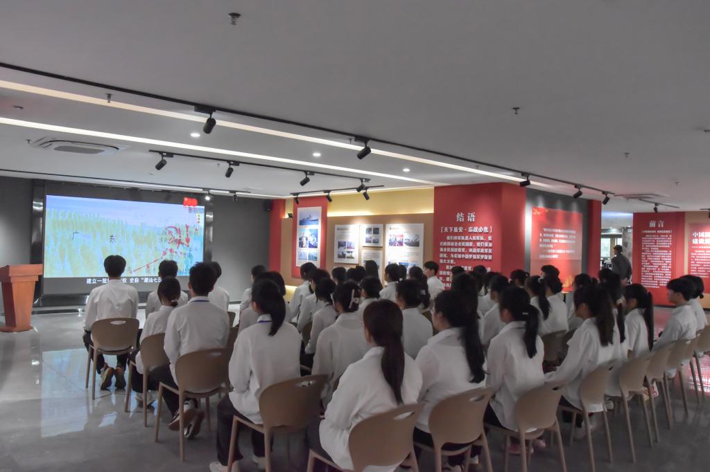 伴着图书馆工作人员的热情讲解,全体师生共同参观图书馆布局与馆中特设的国防教育主题展厅。展厅内,主展区以时间为脉络,展述中国国防建设历程,从“屈辱的近代国防”到“崛起的现代国防”再到“筑梦新时代的中国国防”,世纪回眸间,让学员们认识到国防建设是关系到国家和民族生死存亡、荣辱兴衰的根本大计。