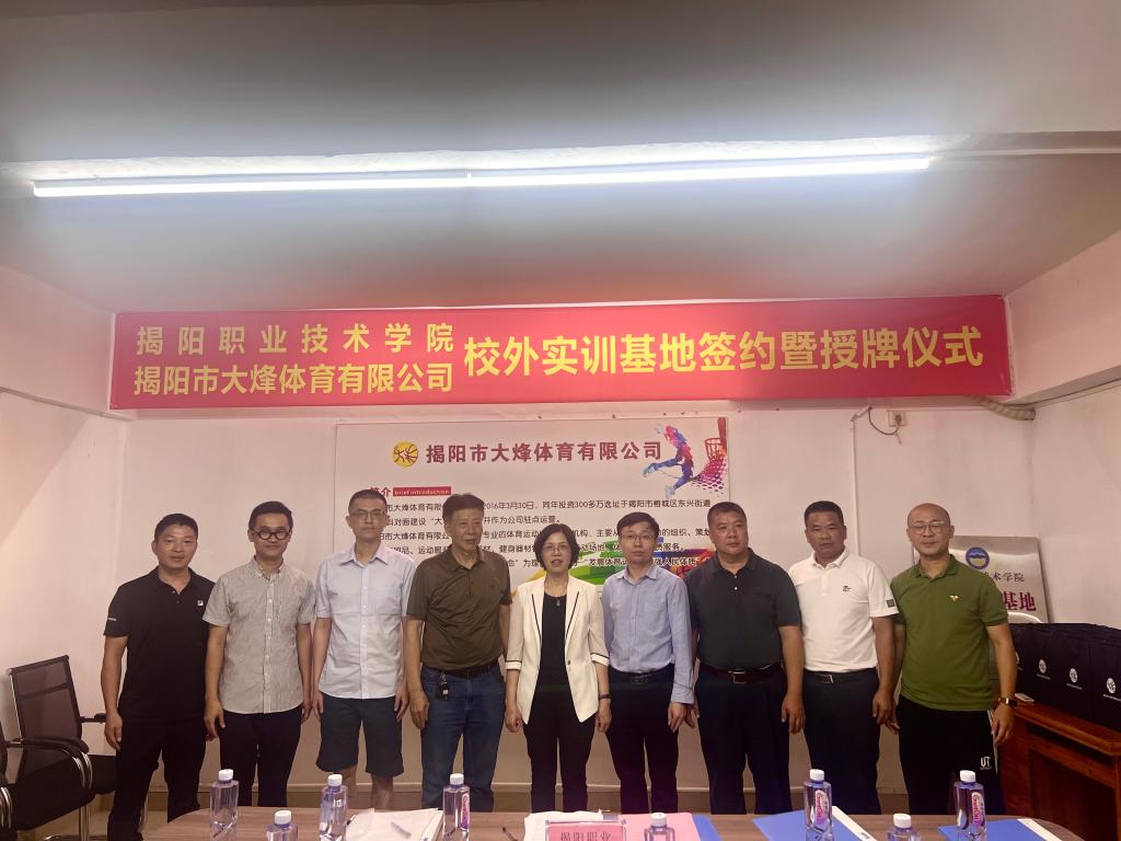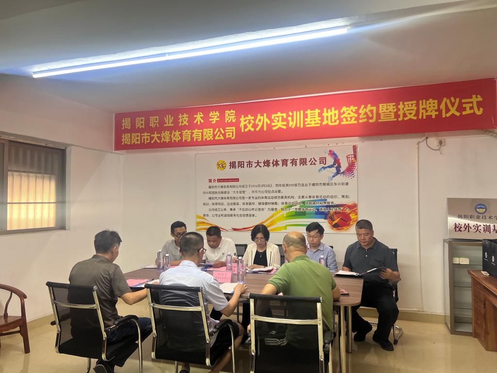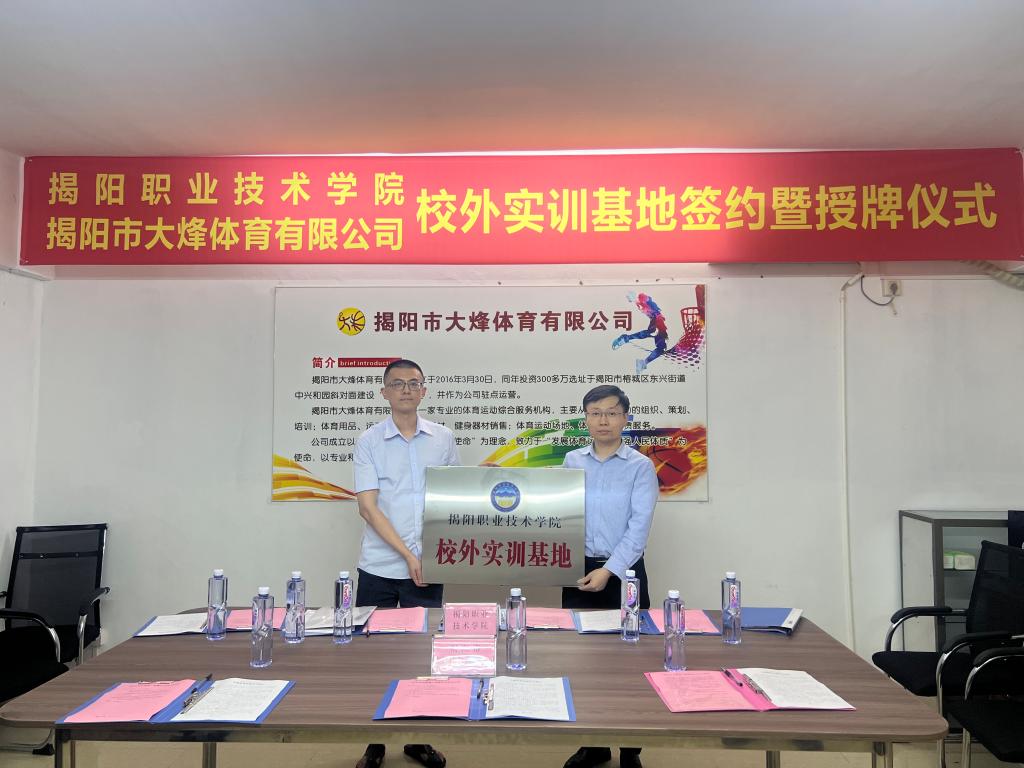为加快行业企业协同育人,促进校企深度融合,实现职业教育高质量发展,5月14日下午,我校艺术与体育系与揭阳市大烽体育有限公司举行校外实训基地签约暨授牌仪式。学校党委委员、副院长刘瑞叶、实训与信息中心党支部书记陈彦彬、艺术与体育系负责人巫会朋、大烽体育有限公司法人代表黄树斌、大烽球馆吴建奕馆长等参加了本次活动。