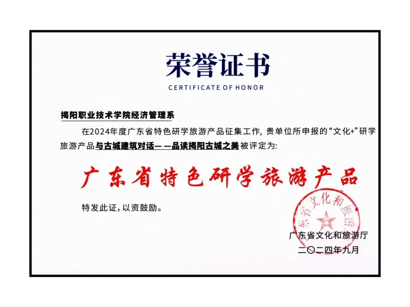 6月,广东省文化和旅游厅组织开展了 2024 年度广东省特色研学旅游产品征集遴选工作,经地市及有关单位推荐、材料审查、专家评审等程序,于近日公布评选结果,我校经济管理系组织师生团队,立足我市实际,充分挖掘揭阳古城博物馆、文保单位等特色研学旅游资源,推出“与古城建筑对话——品读揭阳古城之美”研学产品,成功入选“文化+”特色研学旅游产品名单,为我市研学产业发展提供新方向、新思路。