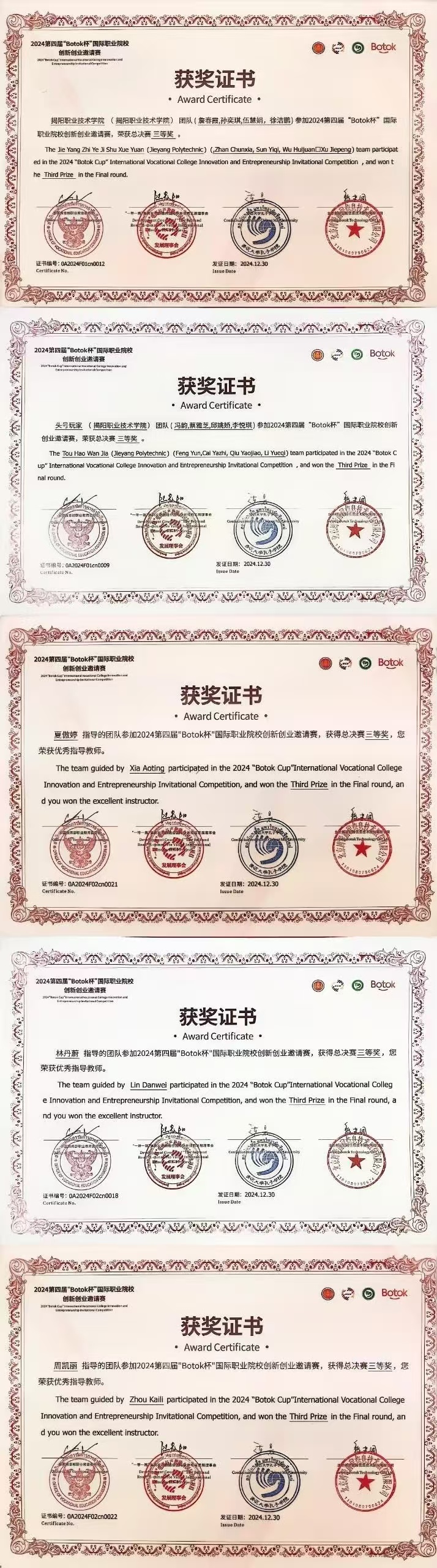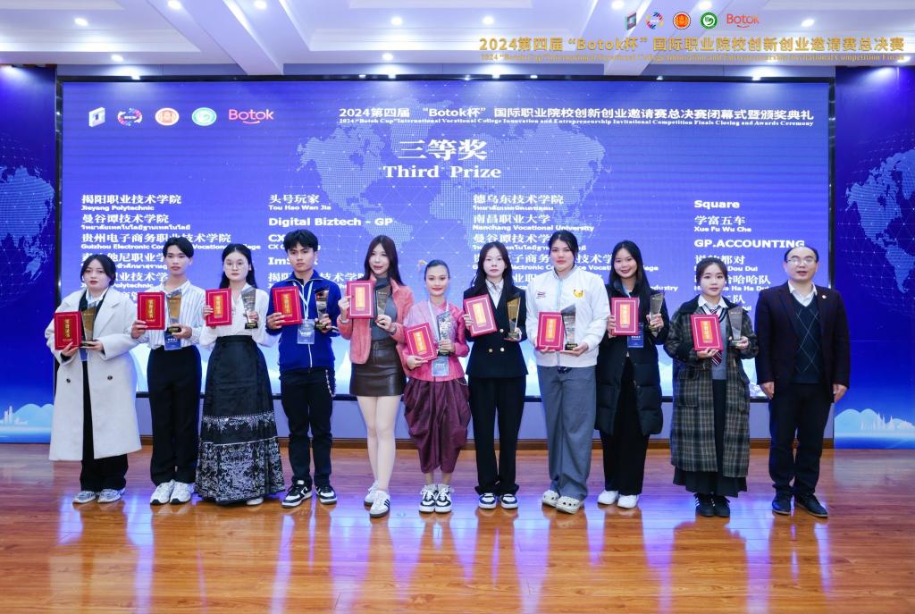 9月至12月,我校外语系商英231班冯韵、邱姚娇,商英231(订单班)蔡雅芝、詹春霞、孙奕琪,商英231(3+证书)班伍慧娟等同学跨系组队,在林丹蔚、夏傲婷、周凯丽老师的指导下参与2024年第四届“Botok杯”国际职业院校创新创业邀请赛并以优异成绩获初赛一等奖,成功晋级决赛。决赛环节,外语系参赛队伍紧密筹备,全力以赴,认真完成赛前复盘报告撰写并于12月27日在夏傲婷老师的带队下赴广西南宁参与28-29日为期两天的现场决赛。经过层层角逐,参赛选手脱颖而出,以优异成绩荣获本次大赛总决赛三等奖。
