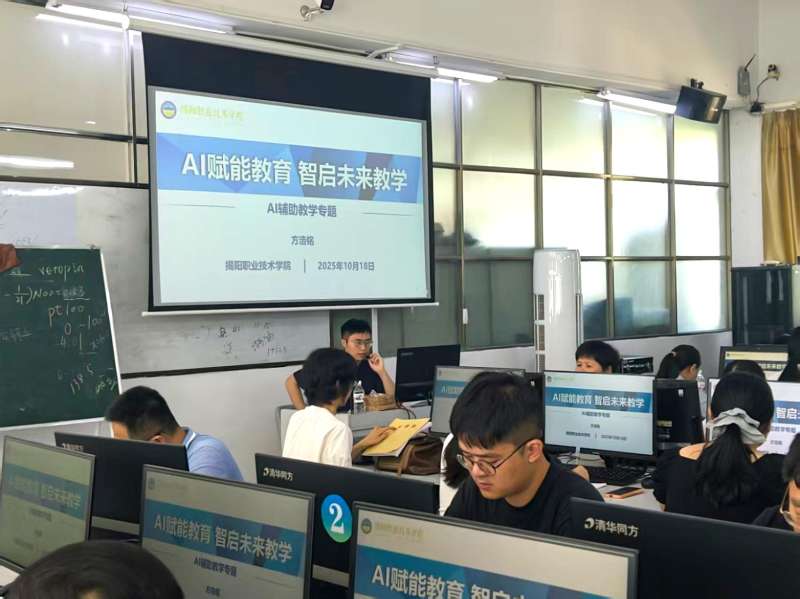 本次培训共5天,由揭阳职业技术学院信息工程系选派经验丰富的教师担任主讲和实验辅导老师。培训聚焦“人工智能+教育”前沿应用,围绕AI基础理论、教学辅助设计、AI绘图与视频生成、数据处理等核心内容开展线下实操,并结合图像处理、文档编辑、演示文稿制作等线上课程,全面提升参训教师的信息技术应用能力。