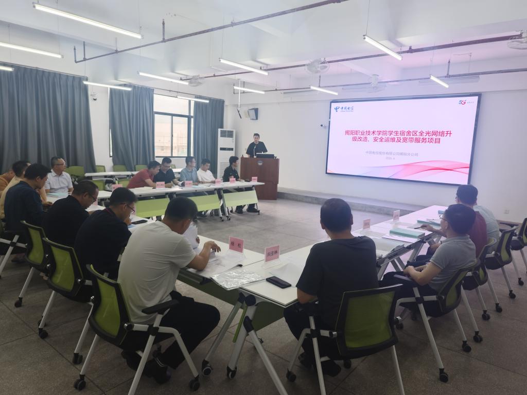 4月21日上午,我校在教研楼604召开学生宿舍区全光网络升级改造、安全运维及宽带服务项目验收会。项目验收组由学生工作处、财务处、后勤服务处代表及2名校外专家构成,中国电信股份有限公司揭阳分公司网络部主管、榕城电信教育团队总监、施工单位代表、设计单位代表、监理单位代表以及我校实训与信息中心主任、分管信息化工作的副主任、网络中心工作人员等参加会议。会议由实训与信息中心主任主持。