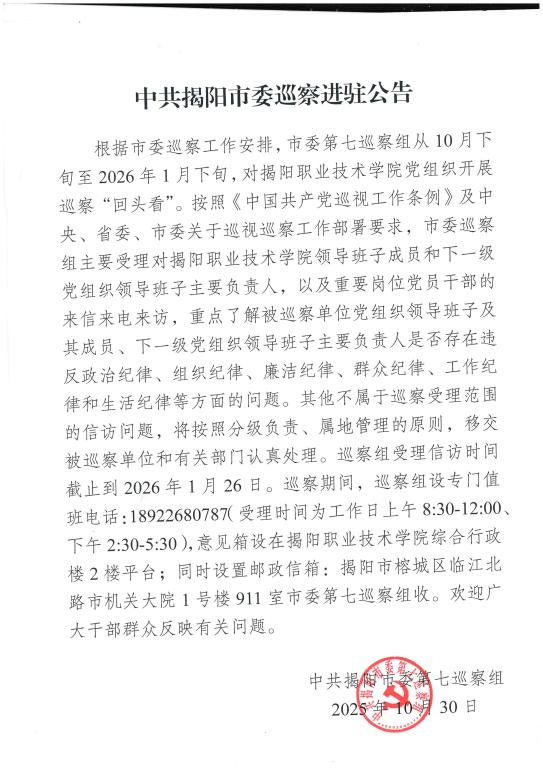 中共揭阳市委巡察进驻公告