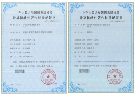 近日,由我系陈锐彬等老师组成的项目组所开发的《诗词大学堂小游戏》、《诗词大学堂国学知识挑战平台》在经过国家版权局中国版权保护中心进行鉴定,初审,复审后,成功获得国家版权局计算机软件著作权登记证书两项。