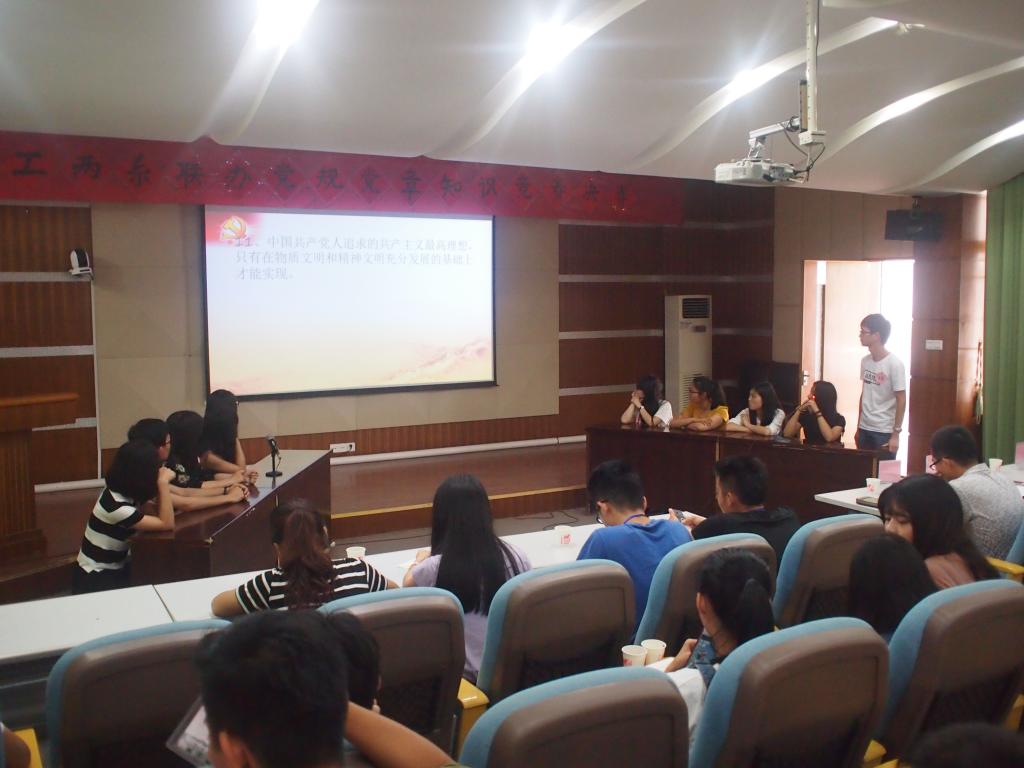 为继续深入开展“学党章党规、学系列讲话、做合格党员”学习教育活动,推进“两学一做”形成常态化制度化,化学工程系与生物工程系于2017年5月18日下午在教学楼AT21联合举办党章知识竞赛决赛。两系的党员、入党积极分子、积极向党组织靠拢的师生参加了比赛活动。化学工程系党总支赖少坤书记观看了本次比赛,化工系学生党支书记刘淑媛老师及生物系学生党支书记林卫霞老师担任了评委。
