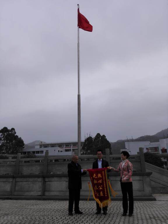 榕城区区政府林少佳副区长和榕城区残疾人联合会姚庆生理事长向揭阳职业技术学院蓝星志愿者赠送“热心公益无私奉献”锦旗,以感谢揭阳职业技术学院师生的公益善举。