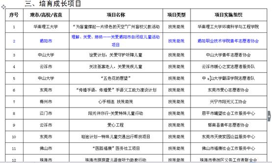 昨日,经省“益苗计划”组委会审定公布的2014年“益苗计划”——广东志愿服务组织成长扶持行动暨志愿服务项目大赛入围项目,共评选扶持推广优秀志愿服务项目169个,覆盖阳光助残、关爱农民工子女、扶贫开发、文化宣传、应急救援、邻里守望、环境保护以及其他等8大领域,我系申报的省级培育成长项目《理解、关爱、接纳——关爱揭阳市自闭症儿童活动项目》获得正式立项。这对我系继续推进特殊群体帮扶和宣传活动等公益服务工作具有重要的意义。