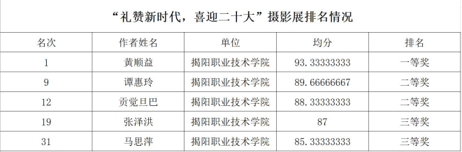 近日,粤东高校思政课协同创新中心公布“礼赞新时代,喜迎二十大”——新时代摄影作品展征集大赛的评选情况,我校报送作品共获得一等奖1名,二等奖2名,三等奖2名的好成绩,其中黄顺益同学取得综合分数第一名的优秀成绩。