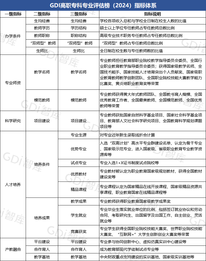 提升高等职业院校关键办学能力、建设开放型区域产教融合实践中心、加强“双师型”教师队伍建设是目前高等职业教育发展的重要方向。GDI高职专科专业评估指标体系设置办学条件、专业师资、科学研究、人才培养和产教融合等5个一级指标,下设教师学历、“双师型”教师、教学名师、模范教师、平台建设、培养条件、培养成果等13个二级指标,新增黄炎培职业教育奖、省级职业教育专业教学资源库、世界职业院校技能大赛奖等多个指标,指标体系不断优化完善,力求客观、全面、科学地评价高职院校专业发展情况。产教融合是现代职业教育的基本特征,也是最大优势,将其设置为一级指标,旨在进一步凸显产教融合的重要性,榜单研制团队介绍说。