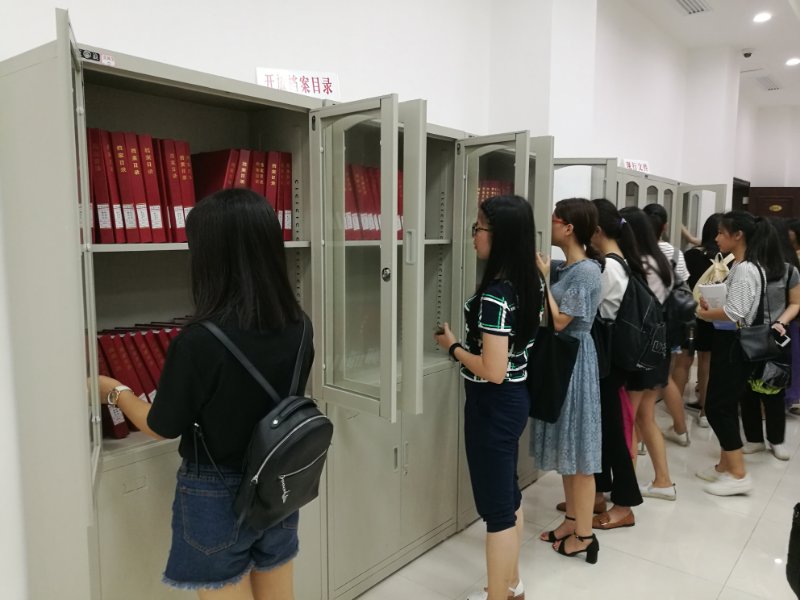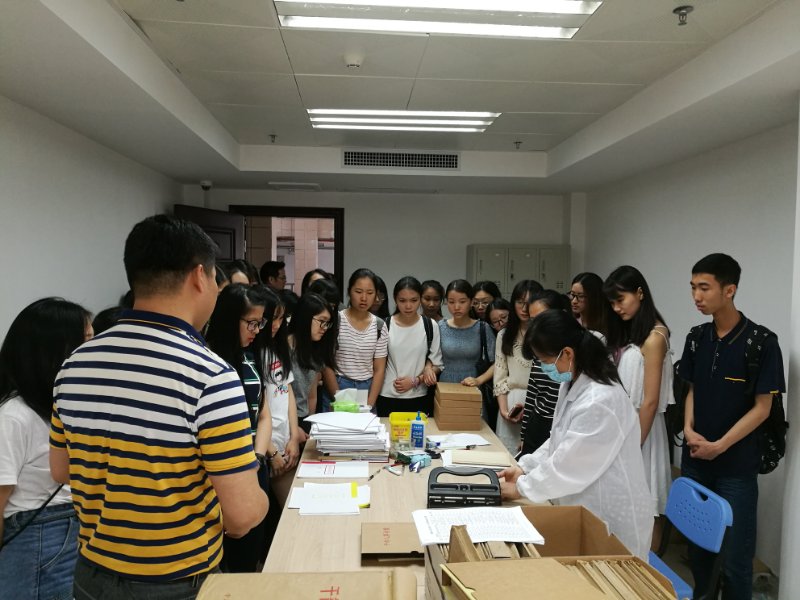 早上9点40分,全体成员乘坐校车出发,于10点10分到达市档案局,并受到工作人员的热情迎接,带领同学们先后参观了档案信息管理中心、档案培训室、档案史料展厅、库区等。在参观过程中,同学们认真听从工作人员的安排,悉心请教专业人员,工作人员也细心为同学们一一讲解,现场气氛和谐。首先参观的是档案信息管理中心,同学们在这里了解档案的目录编排,存档等知识。随后到达多功能报告厅,观看揭阳市档案局关于2017年“6.9”国际档案日的宣传影片,影片为同学们介绍了日常档案分类、装订等归档步骤。稍作休息后,同学们在工作人员的指引下,前往五楼信息化技术室、整理编目室。首先,现场工作人员为同学们演示如何扫描、消毒灭虫、装订文书等,告诉同学们在处理文书时应注意保持文书的原件不受破坏,在存档时要从文书的日期、保存日期等方面考虑并进行有序存放。此外,同学们还参观了存档案的库区,了解了档案存放的环境,工作人员向同学们介绍了库区的温度、湿度,重点向同学们讲解库区的窗户建造。工作人员强调库区的窗户不同于其他窗户,主要在于其是由三层暗色的玻璃组成,目的是使阳光不能直接照射到档案文书。其表示,这是库区首次对外开放,同学们很荣幸拥有这次机会,希望大家好好珍惜并利用这次机会多学到一些专业知识。与此同时,同学们纷纷表示:通过此次活动,进一步了解档案管理知识,提高了自身的专业技能,受益匪浅。最后,同学们到中共广东党组织档案使料展,广东省中小学档案教育社会实践基地、揭阳市爱国主义教育基地进行参观学习,在此过程中了解中共广东党组织的发展历程、揭阳党史、揭阳市貌等。