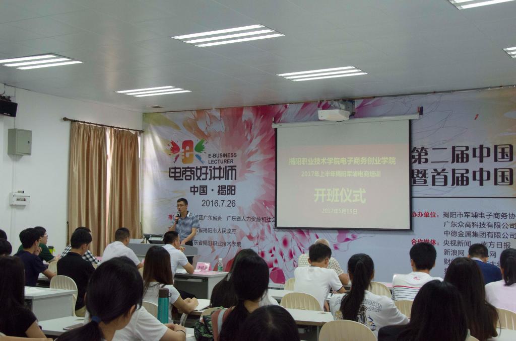 5月15日上午,由揭阳职业技术学院电子商务创业学院举办的“2017年上半年揭阳军埔电商培训班(第二期)”在军埔电商村军埔学校综合教室举行开班仪式。揭阳职业技术学院副院长李桂鑫、揭阳市军埔电子商务协会理事黄作宏,电商学院有关领导老师出席开班仪式。开班仪式由电子商务创业学院副院长兼党总支书记张秋潮主持。
