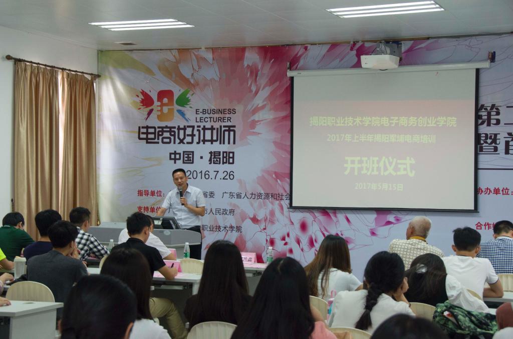 揭阳市军埔电子商务协会理事黄作宏先生向学员分享了电商运营创业的经验和心得,他向学员介绍了军埔村现有实体店400多家、网店4000多家,由军埔电商村的辐射作用,带动了周围村庄三万多家网店的发展。他用自身学习电商以及军埔电商村青年从事电商创业的实例,鼓励大家要依靠自身的学习以及大胆与军埔电商商家交流、探讨,学习军埔电商村商家的理论知识以及创业经验,帮助自己创业。