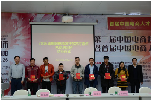 12月27日下午,由揭阳职业技术学院、团市委、市扶贫办共同举办的“揭阳市326期精准扶贫农村青年免费电商培训班”结业仪式在军埔学校大教室举行。揭阳市政府副秘书长兼揭阳职业技术学院副院长黄李昌、团市委副书记陈颖聪、团市委组织部副部长陈旭群以及军埔电子商务协会代表黄作宏出席本次仪式,326期精准扶贫农村青年免费电商培训班学员与军埔学校老师、助教参加此次仪式,由陈旭群副部长主持仪式。