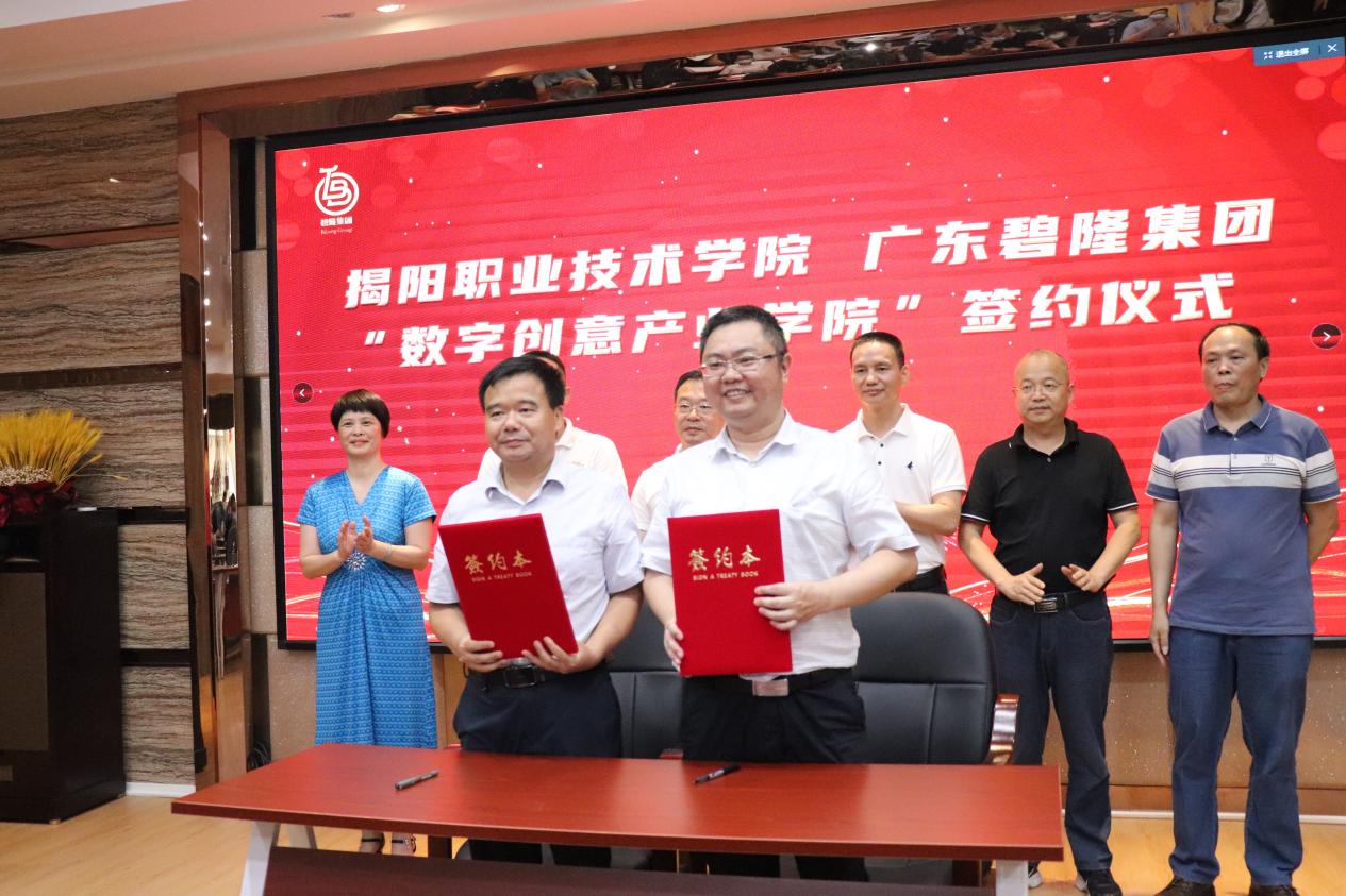 为深入贯彻落实《国家职业教育改革实施方案》,切实推进我校产教融合人才培养模式改革工作,健全多元化办学格局,进一步提高学生的职业能力和就业竞争力,更好地服务区域经济发展,6月27日,揭阳职业技术学院数字创意产业学院揭牌签约暨产教融合协同育人签约仪式在广东碧隆集团隆重举行。揭阳市产业园管委会、广电网络公司等单位参加签约仪式,我校罗恢远院长、李桂鑫副院长、教务处处长黄英铭、电子商务创业学院党总支书记兼副院长张秋潮、机电工程系主任孙培明等参加签约仪式。