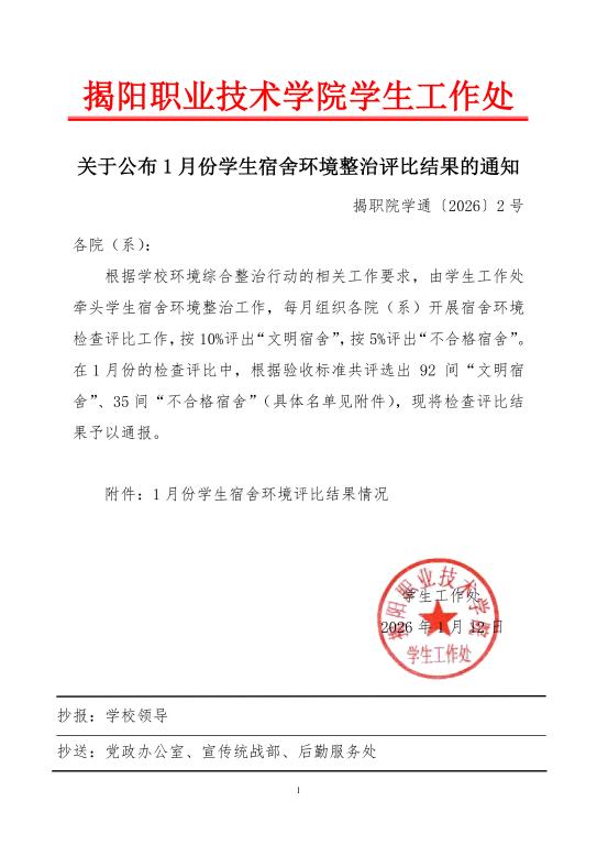 关于公布1月份学生宿舍环境整治评比结果的通知